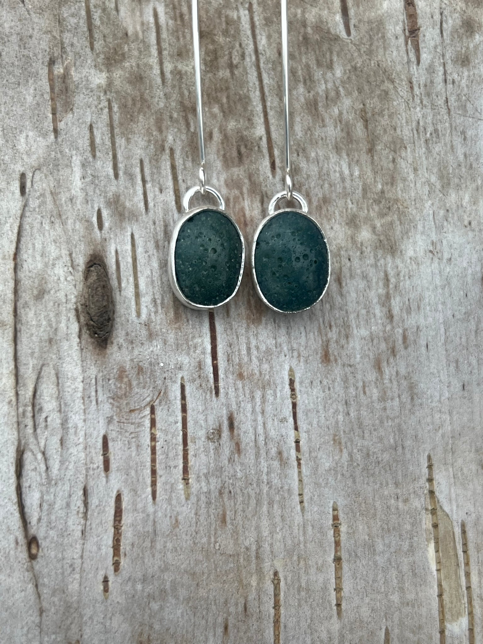 Hand-Hunted Leland Blue, very lightweight and hang 2 inches in length and silversmithed in sterling silver.