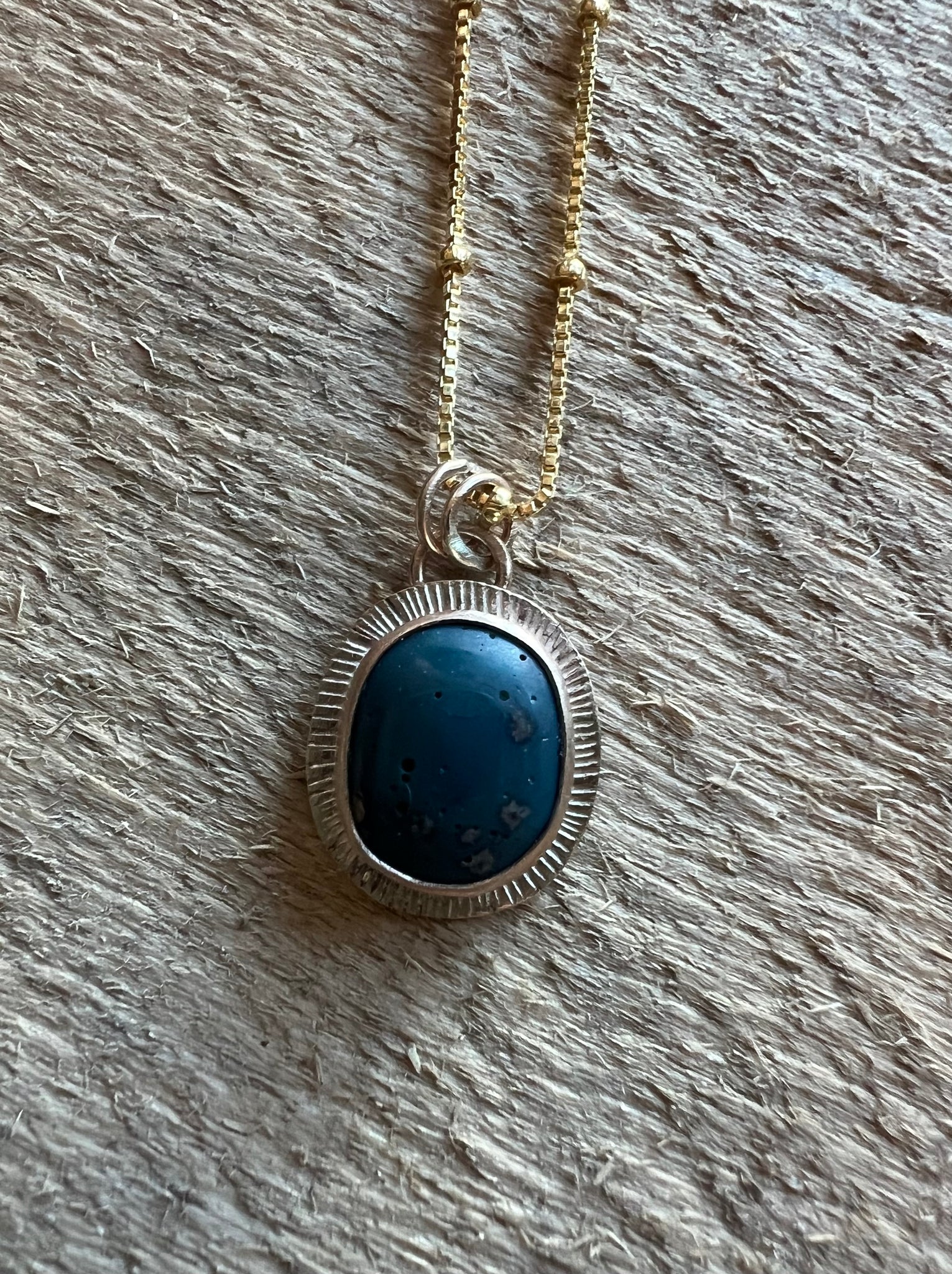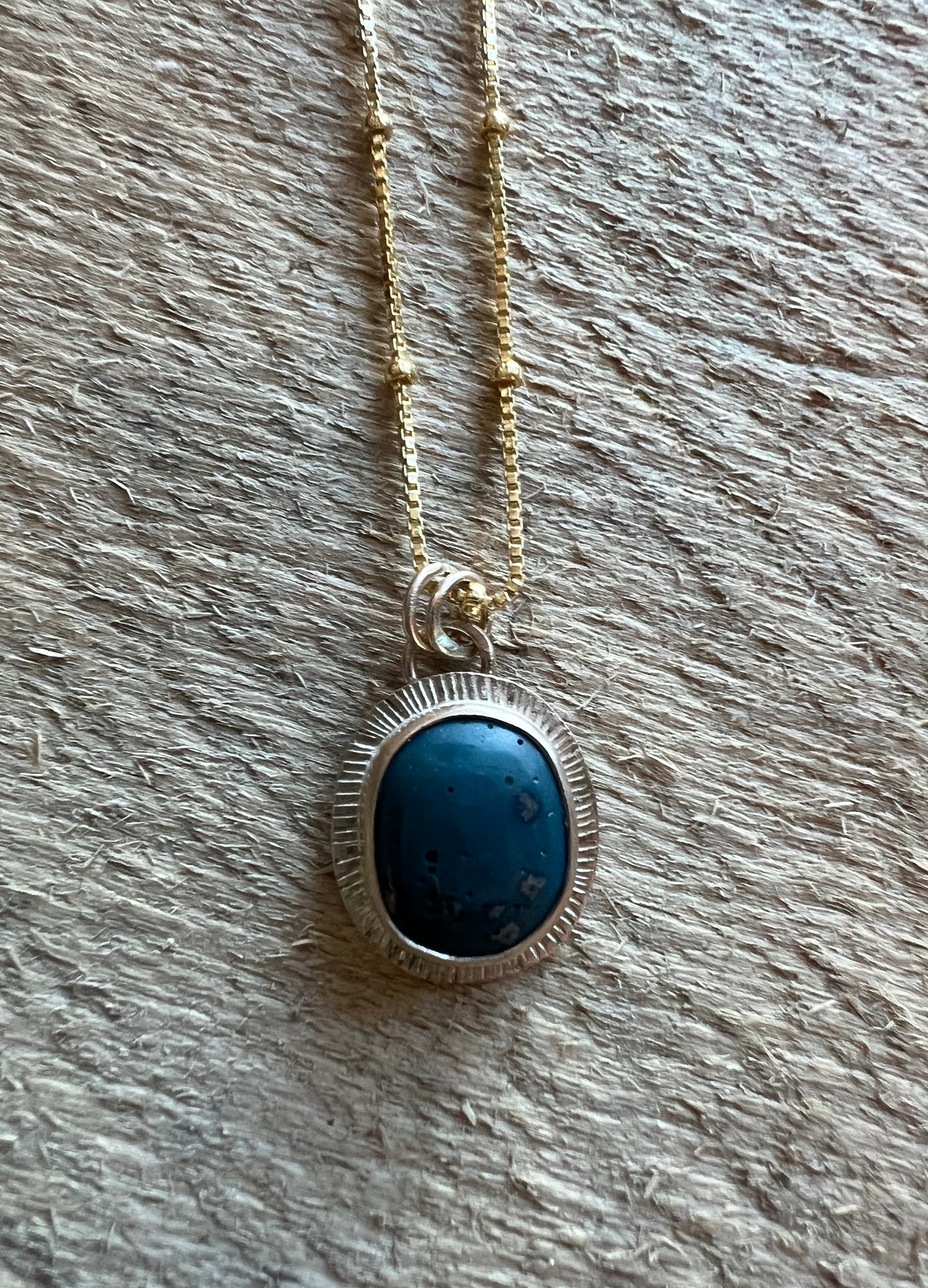 Hand-Hunted, Leland Blue, very lightweight and comes on a 14/20 Yellow Gold Filled 18 inch chain. (14k gold coated) Hand stamped burst design.
