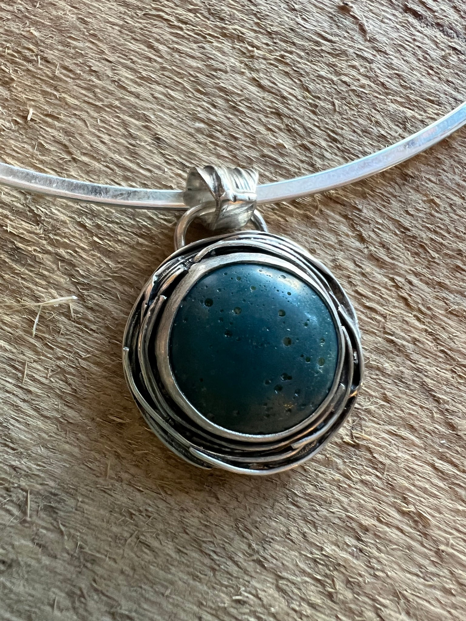 Silver-smithed with Sterling silver, and thin sterling silver wire soldered around the stone to create a nest like look.