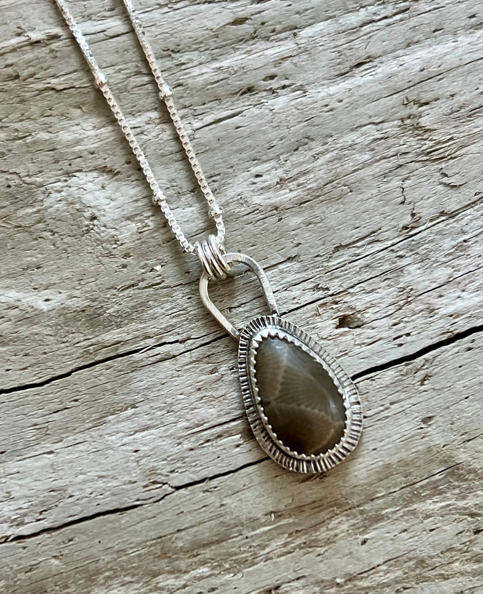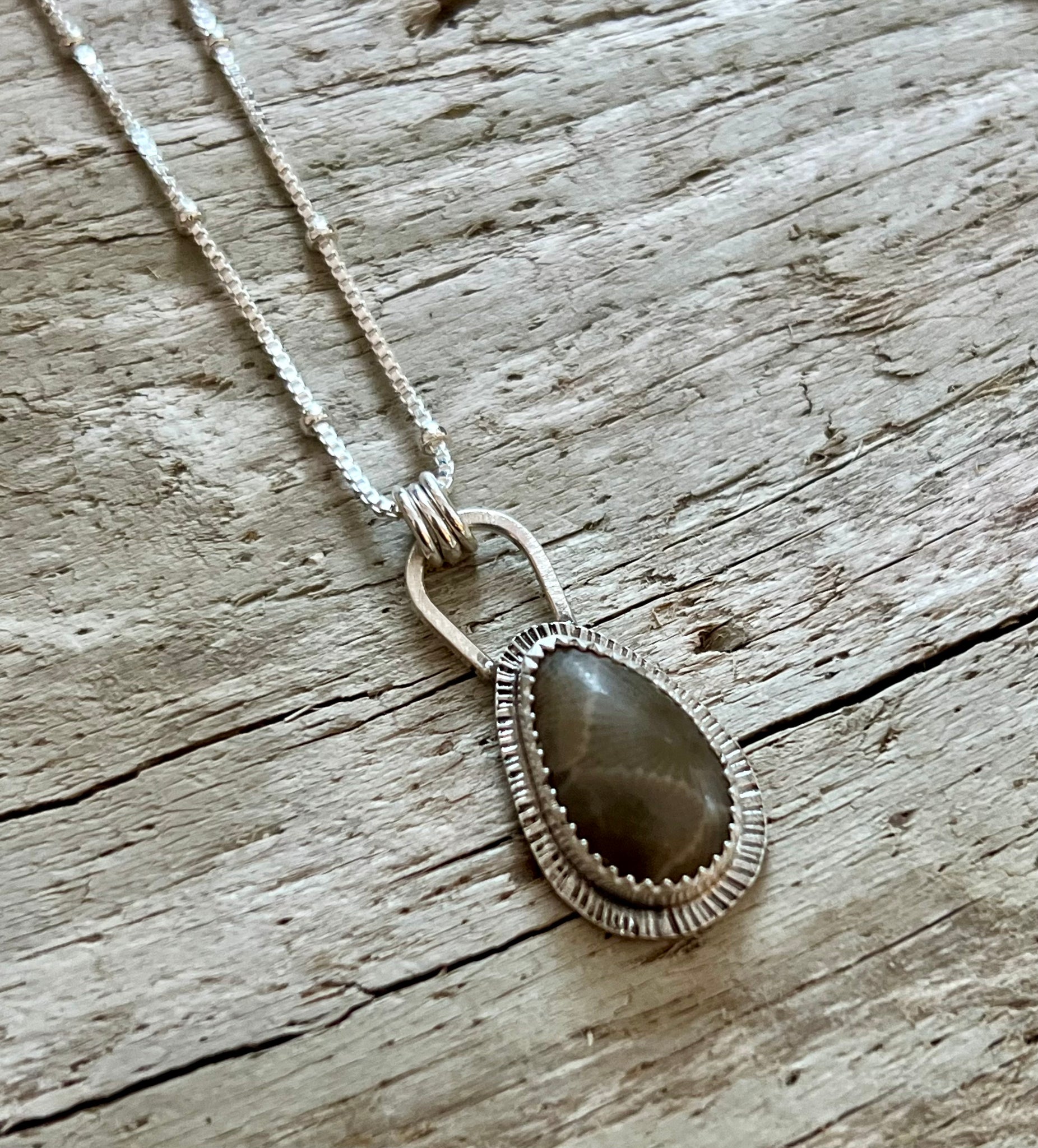 Hand-hunted, hand-cut Petoskey Stone. Silversmithed in sterling silver with hand stamped burst design surrounding stone and a long bale for a subtle statement.