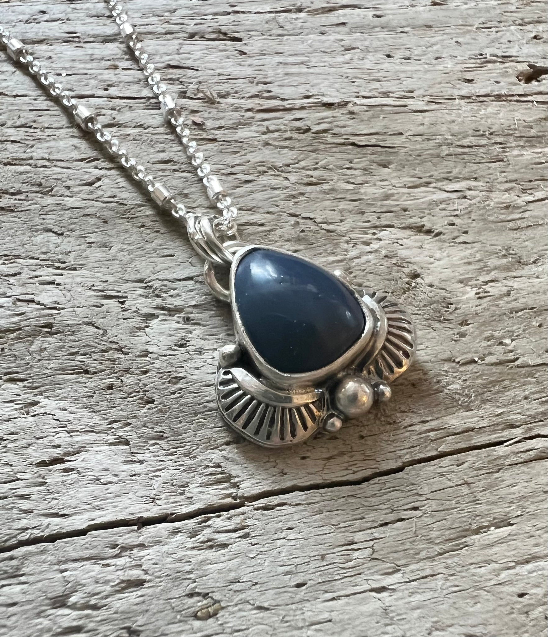 Hand cut and polished teardrop Dark Leland Blue stone. Skirted with hand stamped burst design that are domed out to give a modern look.