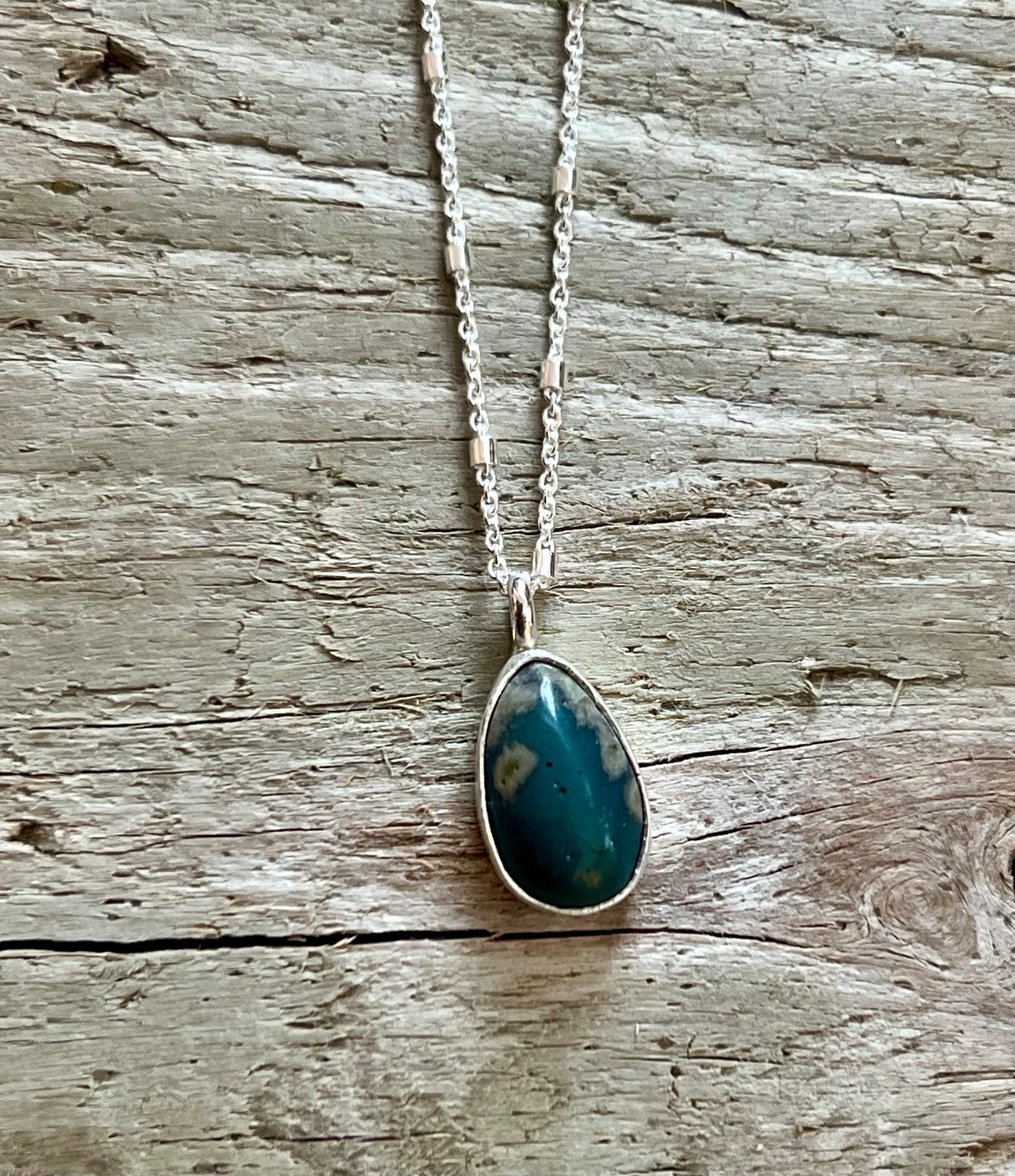 Hand cut and polished Leland Blue stone. Simple sterling silver dainty necklace.