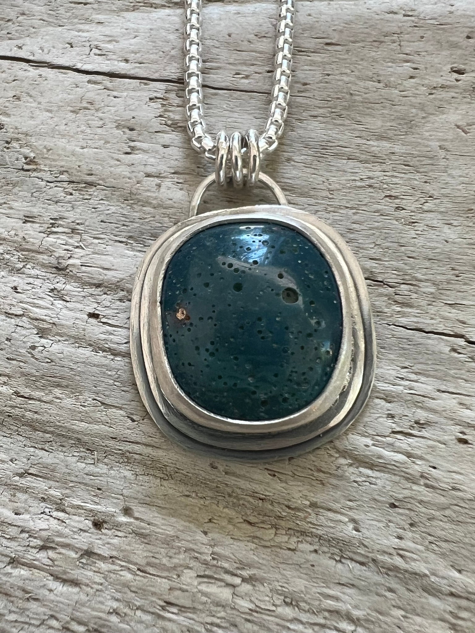Hand cut and polished Leland Blue stone.  Sterling silver double backplate necklace. Piece is about the size of quarter.