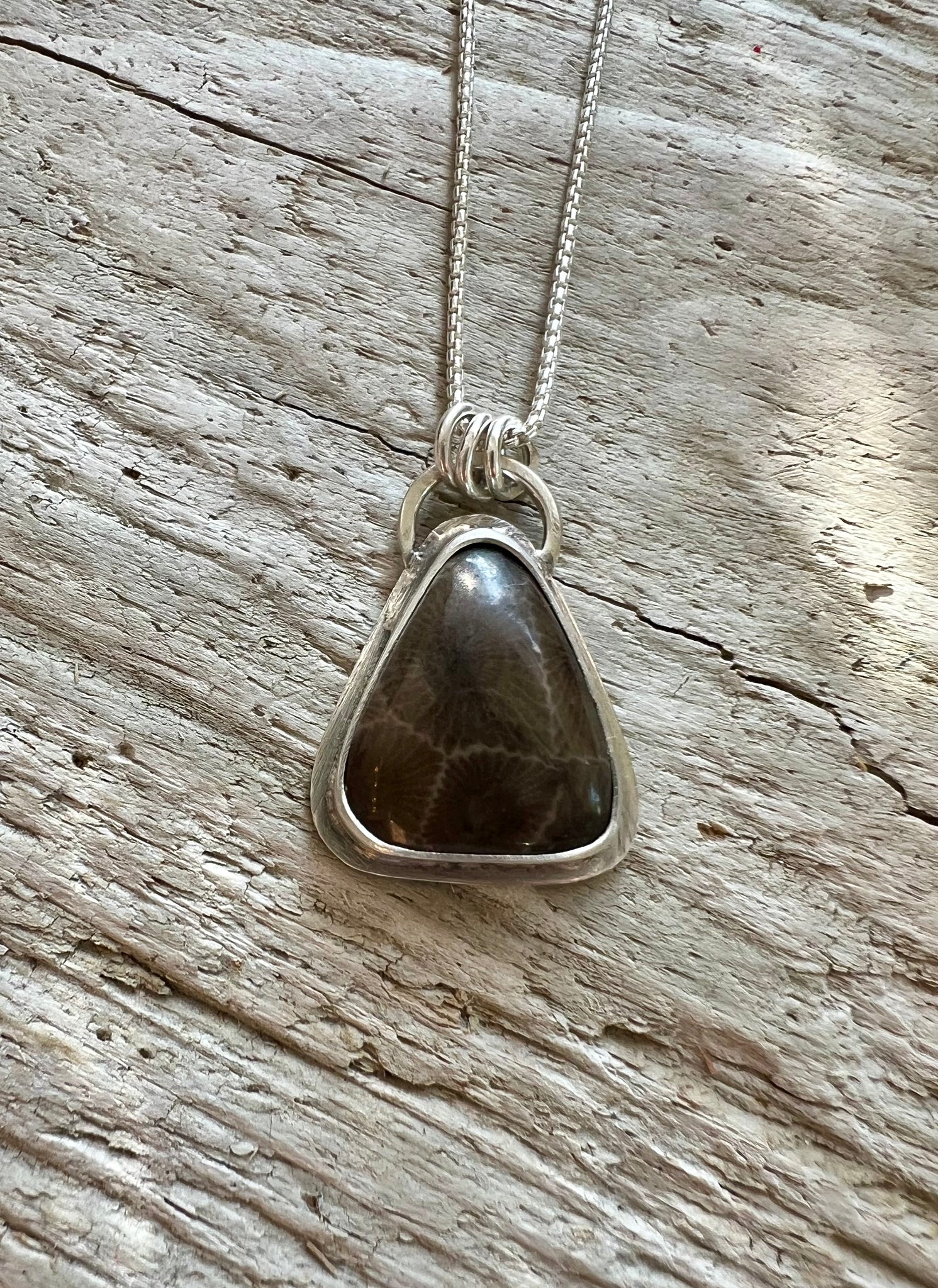Native to Northern Michigan, this unique stone is a Leland, Michigan Treasure hand hunted on the shores of Lake Michigan. Hand hunted rounded triangle Petoskey Stone. Silversmithed in sterling silver.