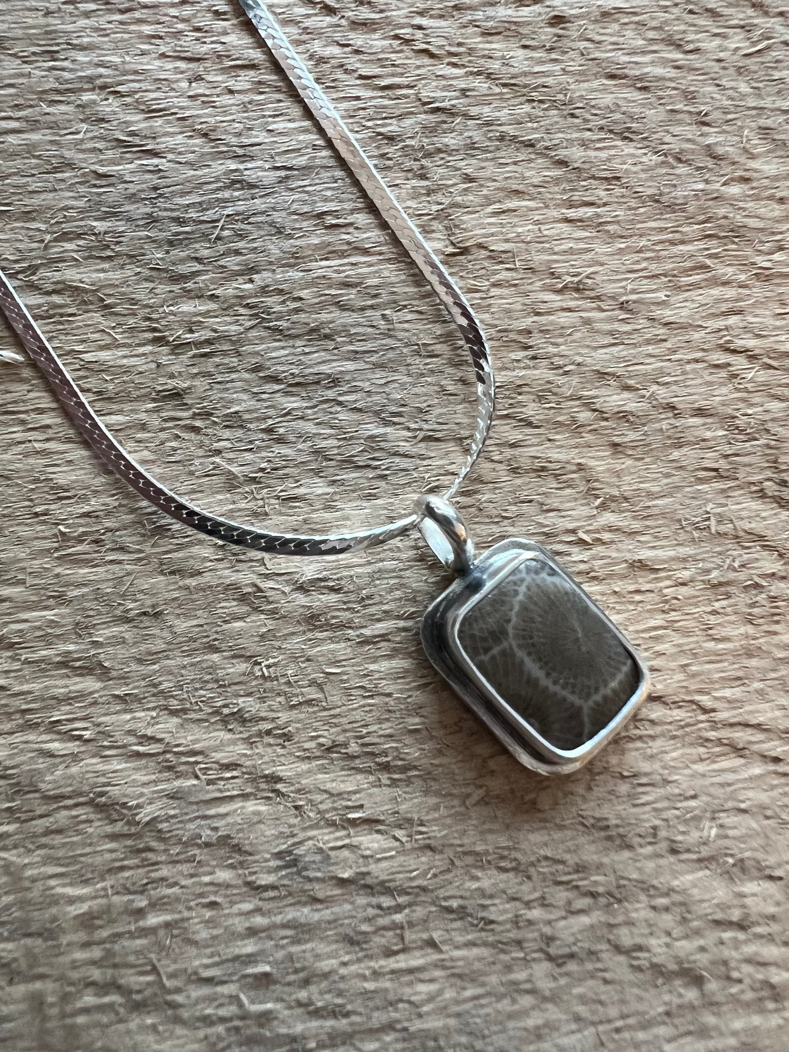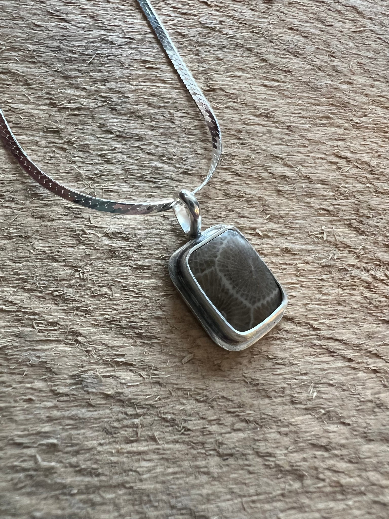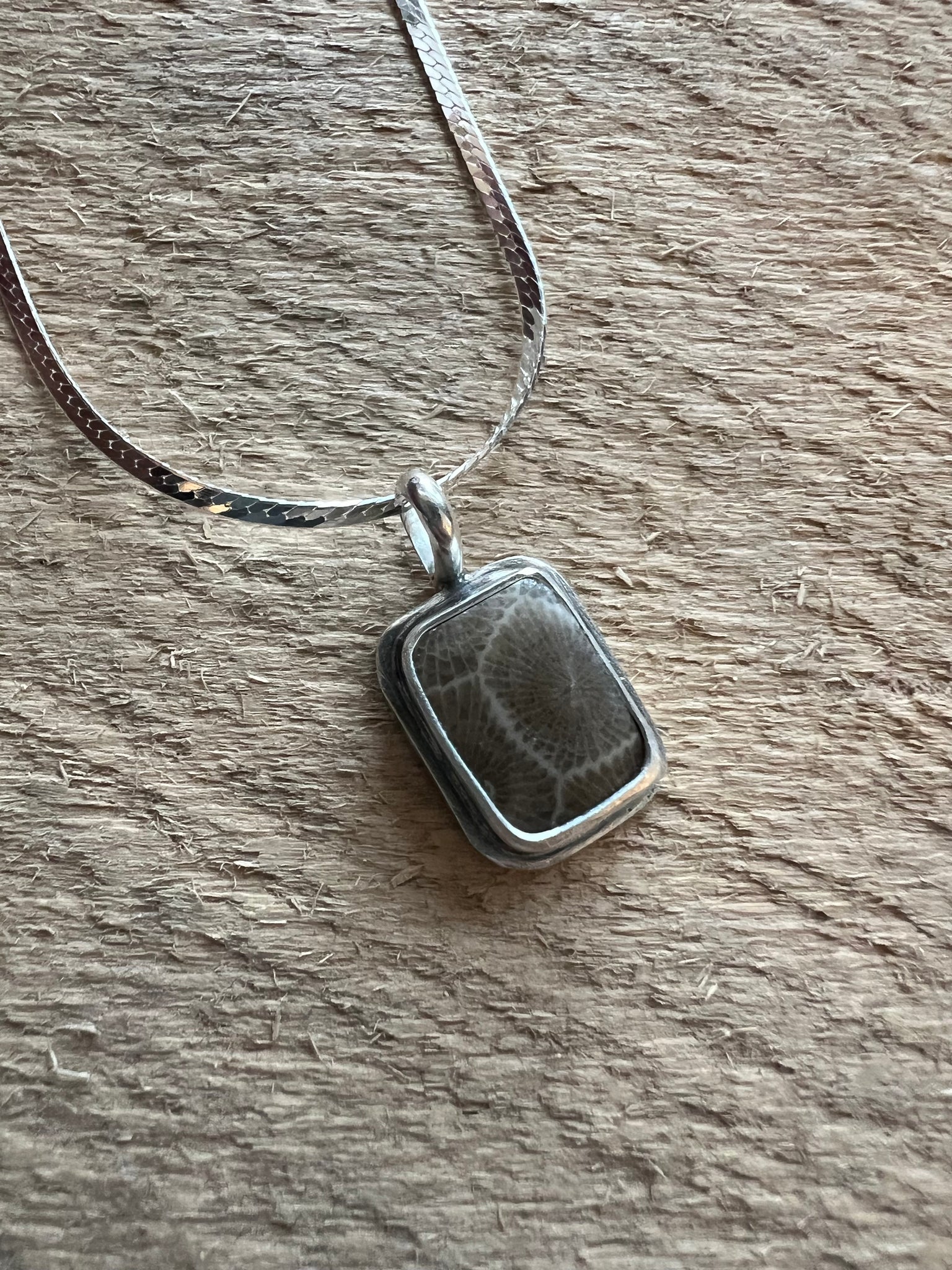 Hand cut and polished rectangle Petoskey stone. Simple sterling silver necklace.
