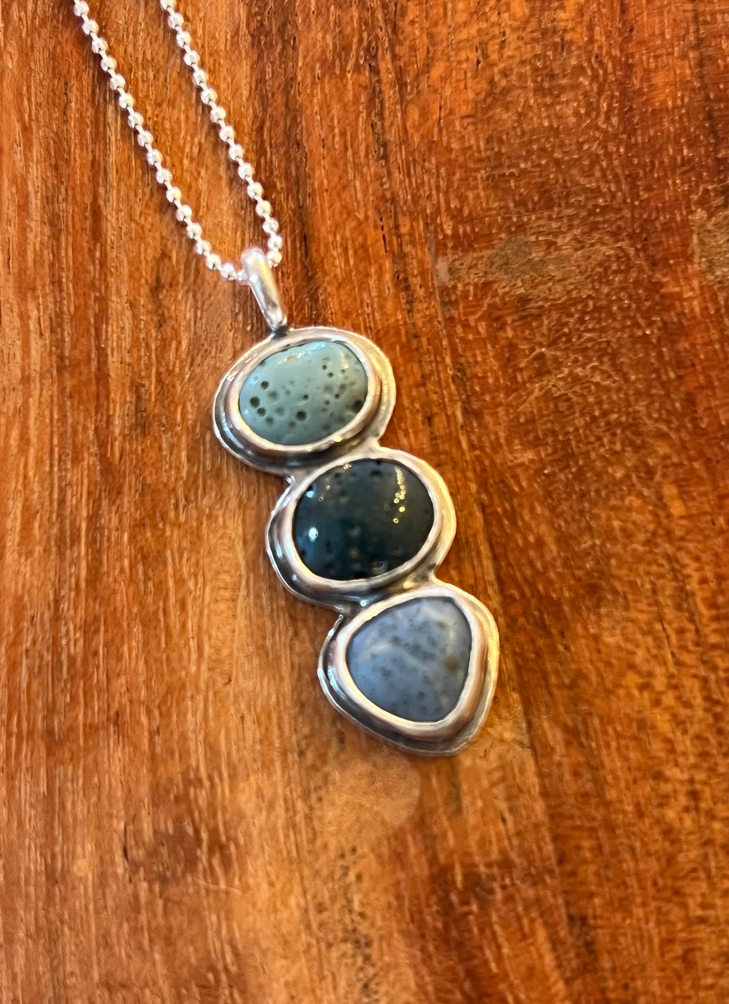 Hand-hunted, hand-cut and polished trio of Michigans favorite stones, three unique Leland Blue & Petoskey stones. Silversmithed in sterling silver.